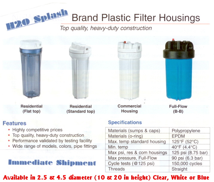 Check our variety of housings - slim line, standard and Big Blue - residential and commercial - clear, blue and white - 1/4 inch, 3/4 inch, 1 inch and 1 1/2 inch inlet/outlet ports.