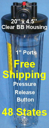 This single 20" x 4.5" Clear Big Blue whole house water filter has one inch threaded inlet and outlet ports The housing is suitable for use with 4 1/2 by 20 inch filters. One carbon filter is included in this package.